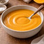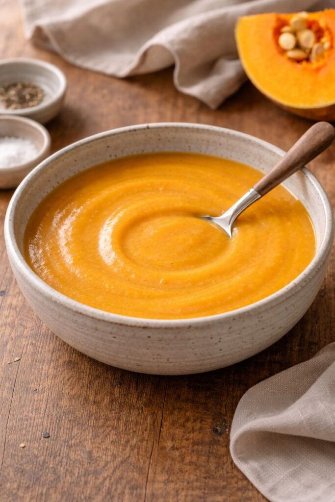 soğan ve bal kabağıyla yapılan, krema eklenmeden hazırlanan sade ve sakin bir bal kabağı çorbası.